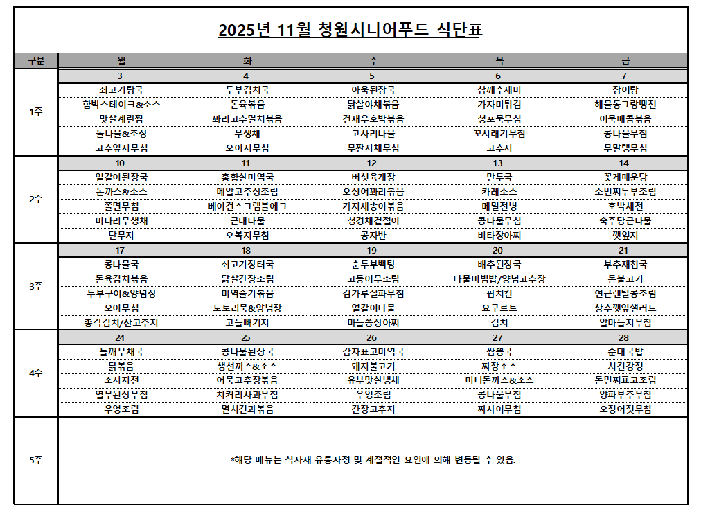 공지사항 인사동정 채용정보 언론보도 보도자료 접수 갤러리 동영상 알림·소식 공지사항 공지사항 조회수 298 작성일 2025.11.07 공지사항 상세보기 - 제목, 내용, 파일, 카테고리, 공개여부 제공 제목 11월 식단표 내용 사진 확대보기 파일 11월 식단표.PNG 카테고리 공지 공개여부 공개 목록 이전글 2025년 제7차 사회복지 자원봉사 인증관리요원 양성교육 확정자 안내 다음글 2025년도 제11차 장애인활동지원사 교육 신청 안내 우리지역에 어떤 복지가? 우리지역 복지기관찾기 충북의 복지행사를 한 눈에!! 복지달력 지역사회보장지표 한 눈에 보기 사회복지자료&정보 바로가기