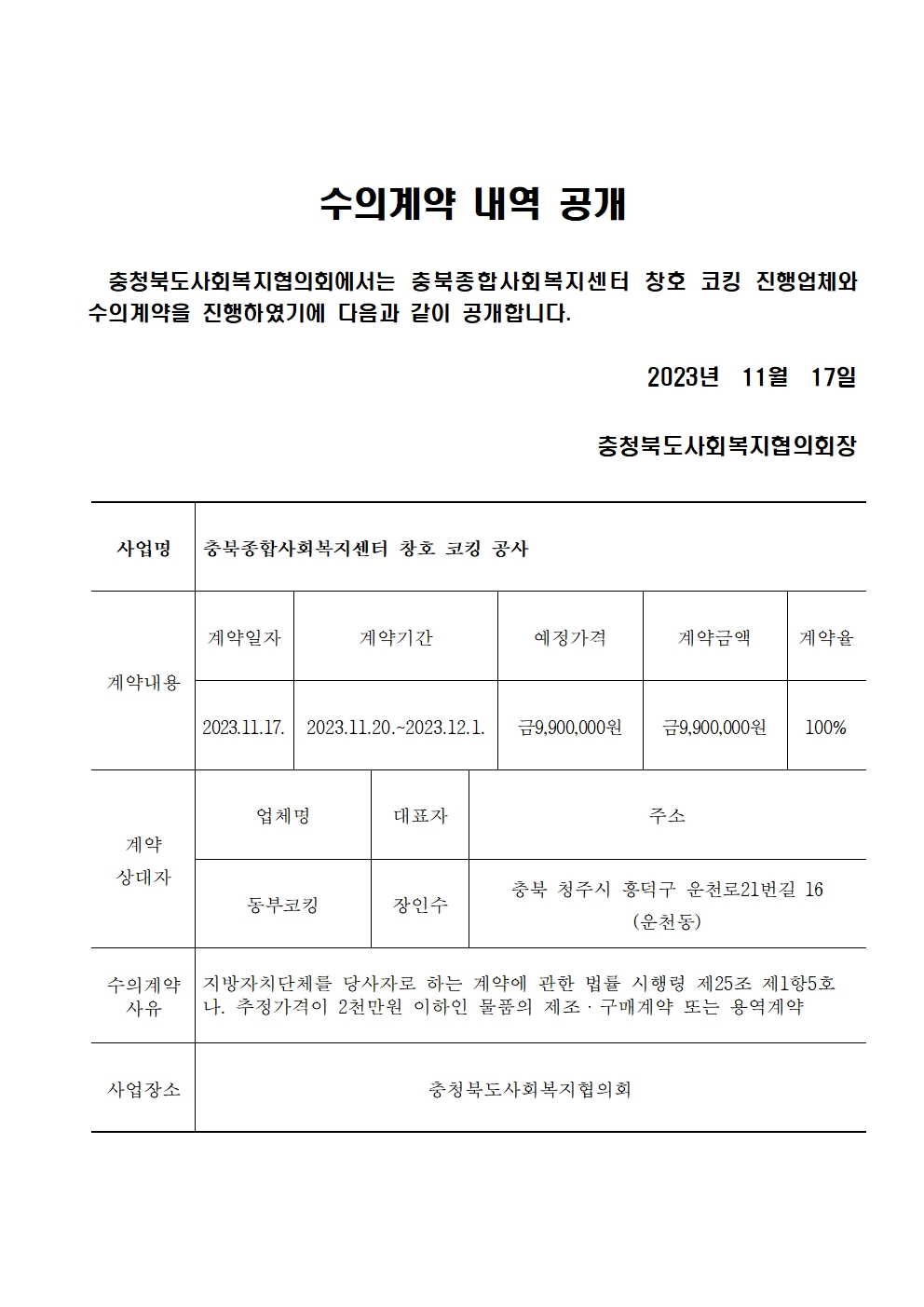 | 제목 | 충북종합사회복지센터 창호 코킹 공사 수의계약 공개 |