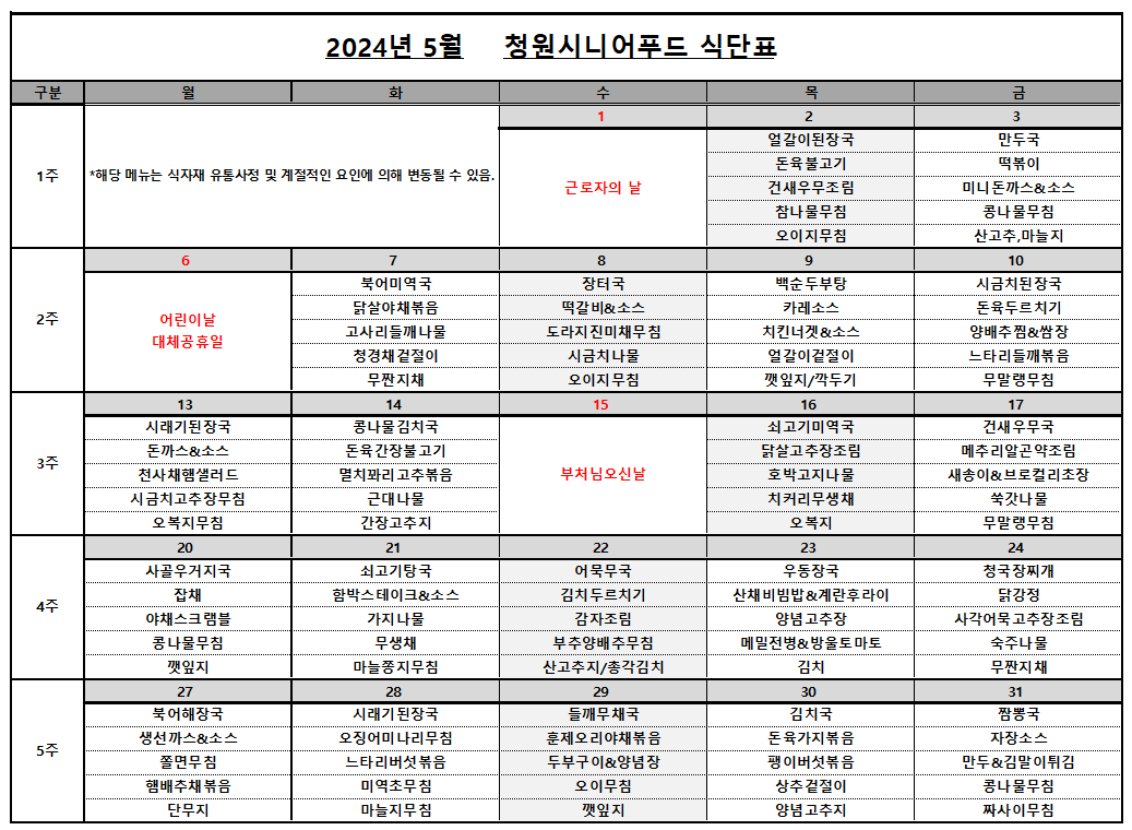 공지사항 인사동정 채용정보 언론보도 보도자료 접수 갤러리 동영상 알림·소식 공지사항 공지사항 조회수 3430 작성일 2024.05.02 공지사항 상세보기 - 제목, 내용, 파일, 카테고리, 공개여부 제공 제목 5월 식단표 내용 사진 확대보기 파일 2024년 5월 식단표.xlsx 5월 식단표.png 카테고리 공지 공개여부 공개 목록 이전글 2024년 사회복지시설 종사자 힐링타임 선정결과 안내 다음글 충북하나센터 직원 긴급 채용 서류전형 합격자 발표 우리지역에 어떤 복지가? 우리지역 복지기관찾기 충북의 복지행사를 한 눈에!! 복지달력 지역사회보장지표 한 눈에 보기 사회복지자료&정보 바로가기
