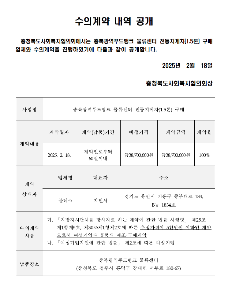 공지사항 인사동정 채용정보 언론보도 보도자료 접수 갤러리 동영상 알림·소식 공지사항 공지사항 조회수 2022 작성일 2025.02.20 공지사항 상세보기 - 제목, 내용, 파일, 카테고리, 공개여부 제공 제목 충북광역푸드뱅크 물류센터 전동지게차(1.5톤) 구매 수의계약 내역 공개 내용 사진 확대보기 파일 수의계약 내역공개의건(지게차1.5톤).png 카테고리 공지 공개여부 공개 목록 이전글 충북광역푸드뱅크 물류센터 전동지게차(2.5톤) 구매 수의계약 내역 공개 다음글 충북광역푸드뱅크 물류센터 실내건축(인테리어) 공사 수의계약 내역 공개 우리지역에 어떤 복지가? 우리지역 복지기관찾기 충북의 복지행사를 한 눈에!! 복지달력 지역사회보장지표 한 눈에 보기 사회복지자료&정보 바로가기