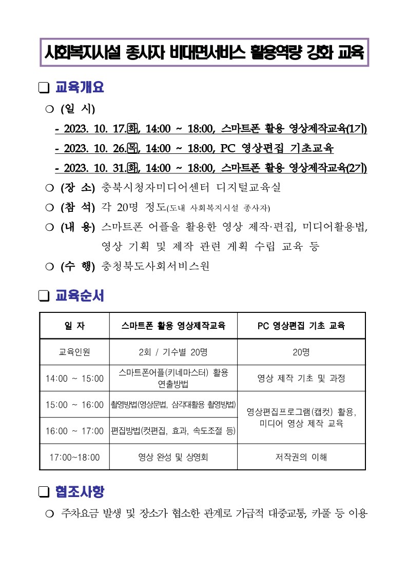 | 제목 | [충청북도] 사회복지시설 종사자 비대면서비스 활용역량 강화 교육 안내 |